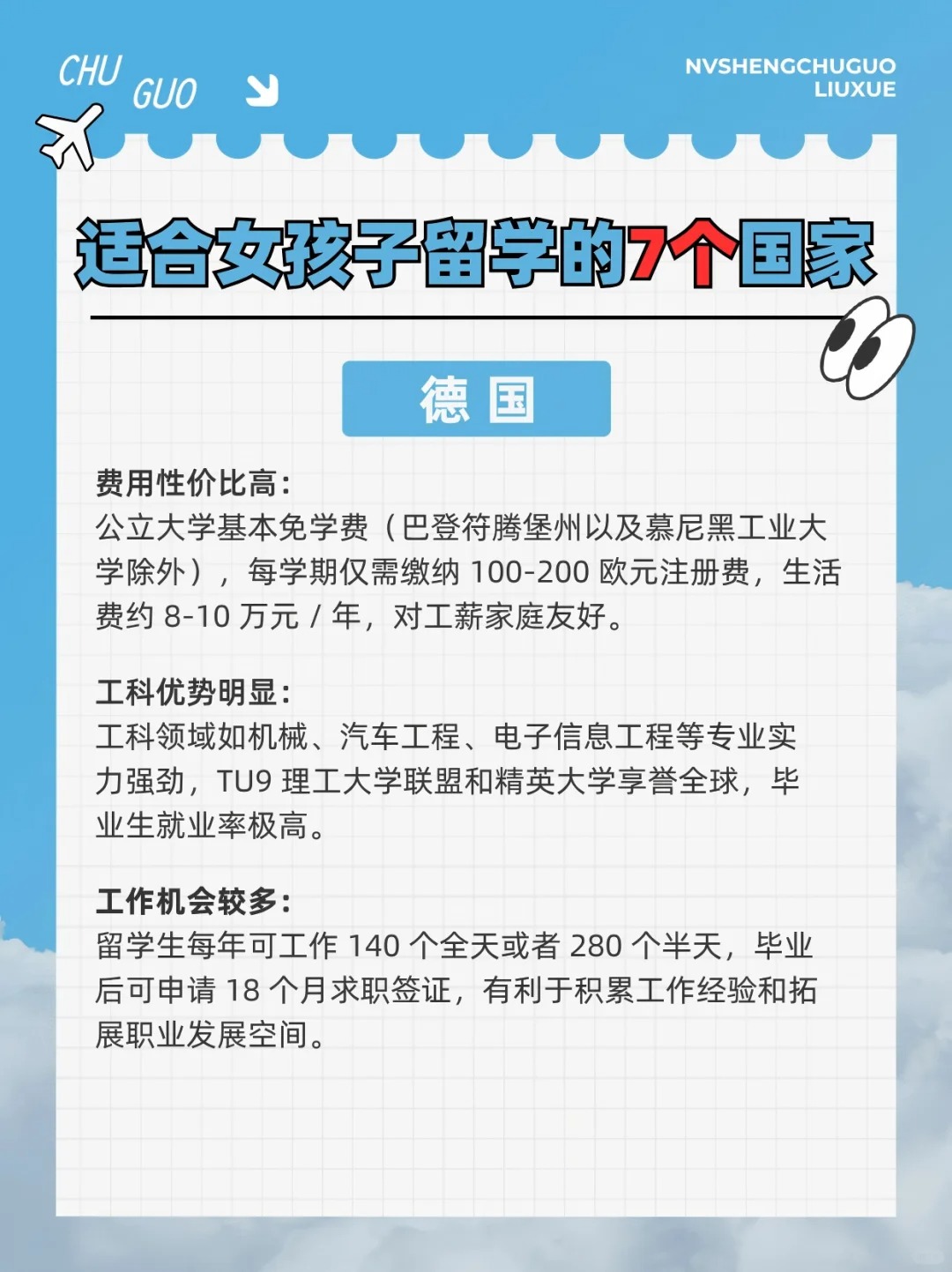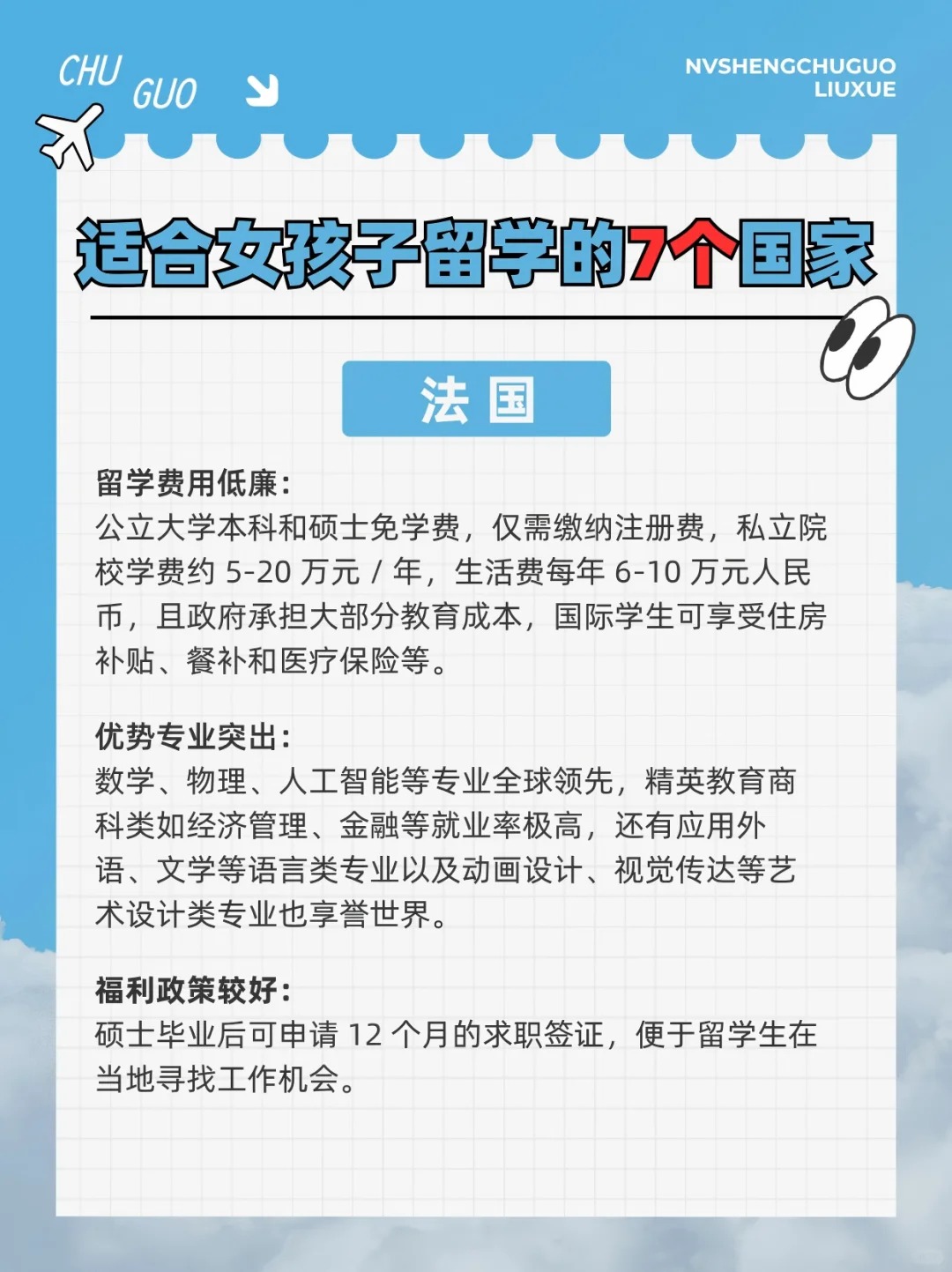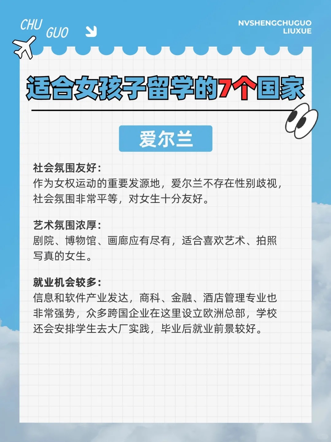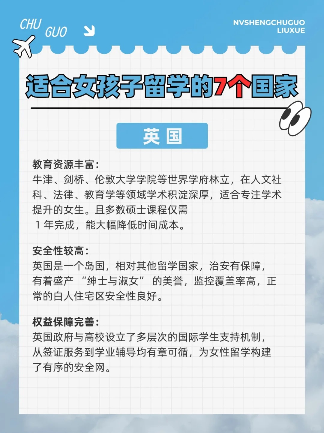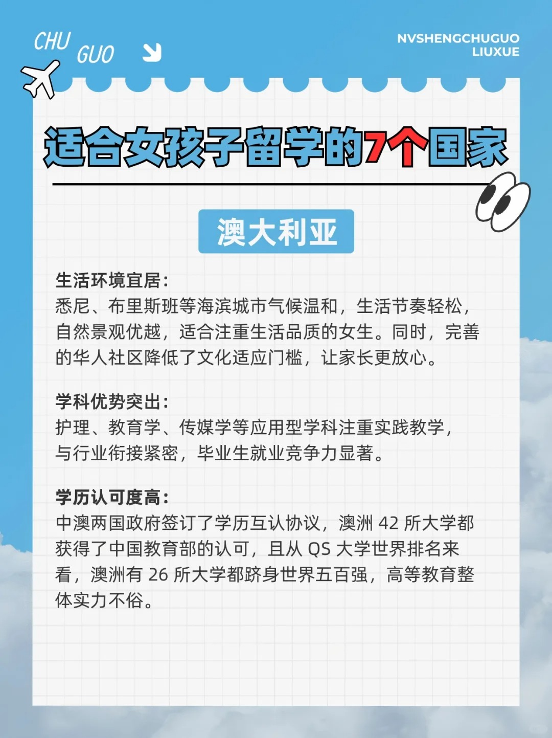 作为女生,我们的留学选择不仅要考虑学术质量,还要想想安全、文化氛围、生活质量等等。今天就和大家分享最适合女生读本科/硕士的留学国家Top 7,主打一个安全、包容、生活便利+高性价比⬇ . ✅英国 女生们都知道,英国可是留学圣地!无论是牛津、剑桥,还是伦敦的各大名校,教学质量都是世界一流 ◾适合专业:国际关系、文学、设计、金融等 ✅爱尔兰 小众但含金量高,超多大厂在这里设总部~英语授课,适合不想学小语种的女生 ◾适合专业:传媒、教育、艺术设计、商科等 ✅法国 法国的艺术氛围浓厚,特别适合对时尚、艺术、设计感兴趣的女生 ◾适合专业:艺术、设计、奢侈品管理、国际关系 ✅德国 喜欢理工的女生首选,城市安全指数高,生活节奏较慢,生活成本比其他西欧国家低 ◾适合专业:工科、机械、建筑、城市规划、经济等 ✅澳大利亚 生活幸福指数高,大学世界排名高,如墨大、悉大、ANU等 ◾适合专业:心理学、教育、护理、传媒、生物等 ✅新西兰 教育体系与英联邦接轨,认可度高,社会治安良好,压力较小,非常适合性格温和的女生 ◾适合专业:教育、环境科学、护理、心理咨询