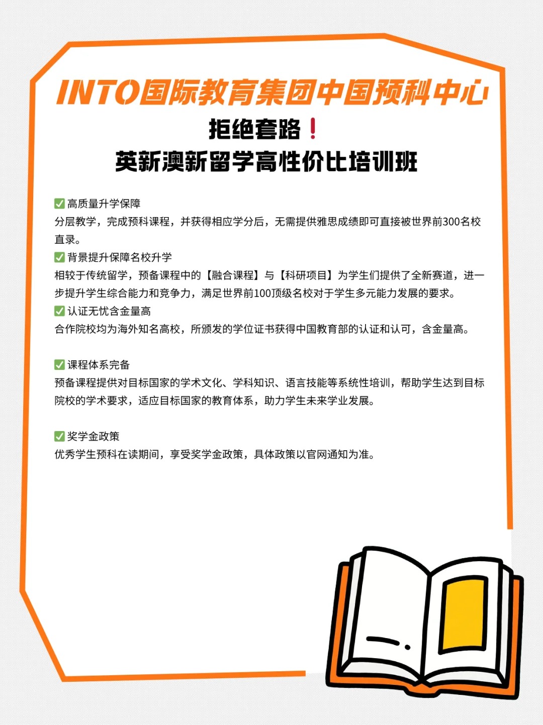 📢同学们!真的别再死磕高考独木桥了!可以多看看英新澳留学!英国、新加坡、新西兰、澳大利亚在教育质量、留学成本、入学门槛等方面都有各自的优势,能为成绩普通的孩子提供了广阔的留学空间以及就业选择📈 而且现在英新澳很多顶尖大学都接受预科成绩,高二结束就能申请,平均分 60 + 也有机会冲 QS 前 100哦~ . 💡哪些孩子最适合走预科? ✅高中成绩中等偏下,想进世界名校 ✅偏科严重但有擅长领域(比如艺术 / 商科) ✅英语基础一般,需要过渡期适应学术环境 . 【西安 电 ⼦ 科 技 ⼤ 学 ⻘ 岛计 算 技 术 研 究 院 & I N T O 教 育 集 团 国 际 预 科 课 程 】 ✅ 完成课程且成绩达标,就能被目标国家高校直录,名校直录不是梦 ✅ 背景实力强,提供融合课程及科研项目,助力提升综合能力,增强申请名校竞争力。 ✅ 课程体系完备,快速帮助适应海外教育体系。 ✅ 灵活性高,适配不同学习需求 ✅ 支持服务贴心,全程保障学生发展 . 预科就像一个“缓冲带”,用一年左右的时间帮你打基础,适应国外的学习节奏和模式,只要预科成绩达标,就能顺利升入对应的本科啦~ 如果您也有一个名校梦,随时dd!