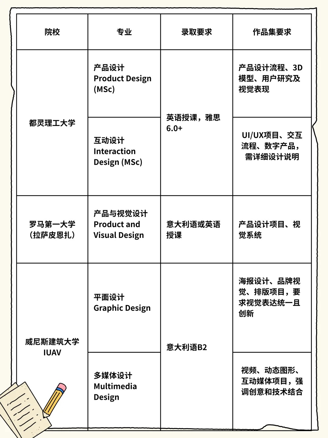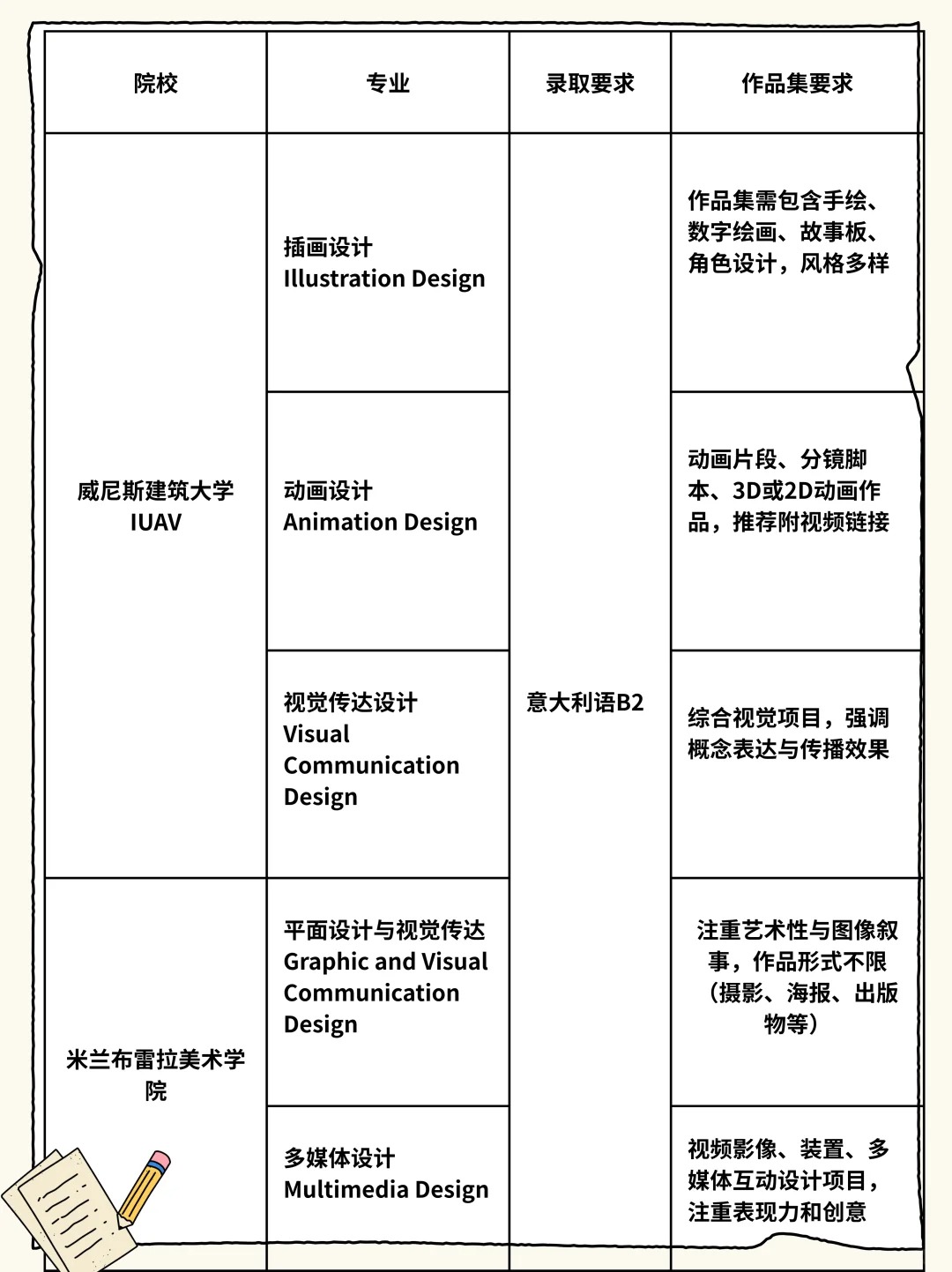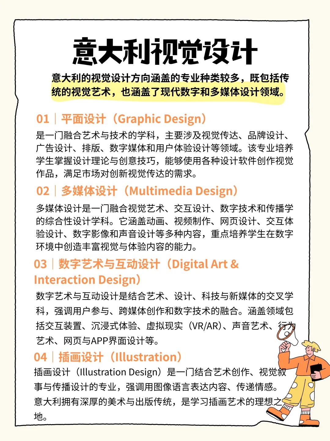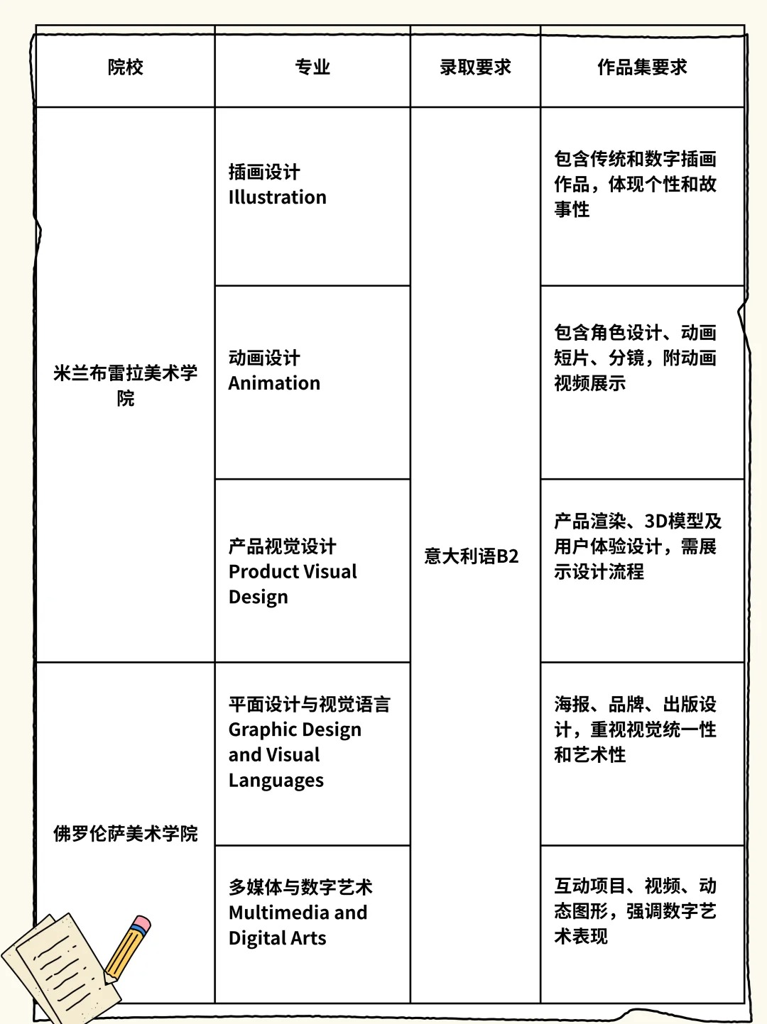 意大利的视觉传达设计专业(Visual Communication Design / Comunicazione Visiva)在欧洲设计界占有重要地位,融合了传统美学与现代数字技术,培养具备图形设计、品牌策略、数字媒体、交互设计等综合能力的设计人才。 为了帮助正在规划留学的小伙伴,我整理了几所有综合类大学和公立美院,供大家参考。 📄【申请这些美院你需要准备什么?】 📌 申请要求总结如下:学历背景:本科毕业,艺术类优先; 语言要求:雅思6.0/意大利语B2 材料准备:成绩单、推荐信、语言证明、作品集(最关键) 【作品集是门槛也是通行证】意大利美院通常要求提交3-5个完整项目,具体数量因学校而异。若提交三个项目以下,则无法全面展示学生的专业能力,作品集内容将显得单薄。若提交五个项目以上,则容易使人感觉冗余,无法凸显个人作品风格的代表性,言多必失,作品过多也容易暴露缺点。在作品集数量方面,美院教授更多看重的是质量而非数量。 很多中国学生在作品集准备上的常见误区是:只关注展示最终作品,忽略草稿及所涉及的实验步骤过程。 比起作品本身,意大利美院教授更希望看到的是创作心路历程和各种尝试,比如: ● 灵感来源 ● 草图 ● 材料实验 ● 失败尝试与改进 ● 最终成品展示 作品种类多样化,展现完整的综合能力意大利美院鼓励学生多在作品中尝试不同的技法和媒介, 作品集可以囊括: ● 传统绘画作品 (油画、水彩、版画、新材料绘画等); ● 雕塑/装置/立构模型; ● 数字艺术(摄影、视频、动画等); ● 行为艺术/概念艺术等。 🧭【我是谁?我能帮你做什么?】 我是Cinzia,曾在意大利留学4年,就读于都灵理工大学 回国后从事欧洲留学规划5年,目前自己运营留学公司,专注帮助中国学生申请意大利等国家的高性价比留学路径。 📩 如果有留学方面的问题,欢迎留言or私信我!