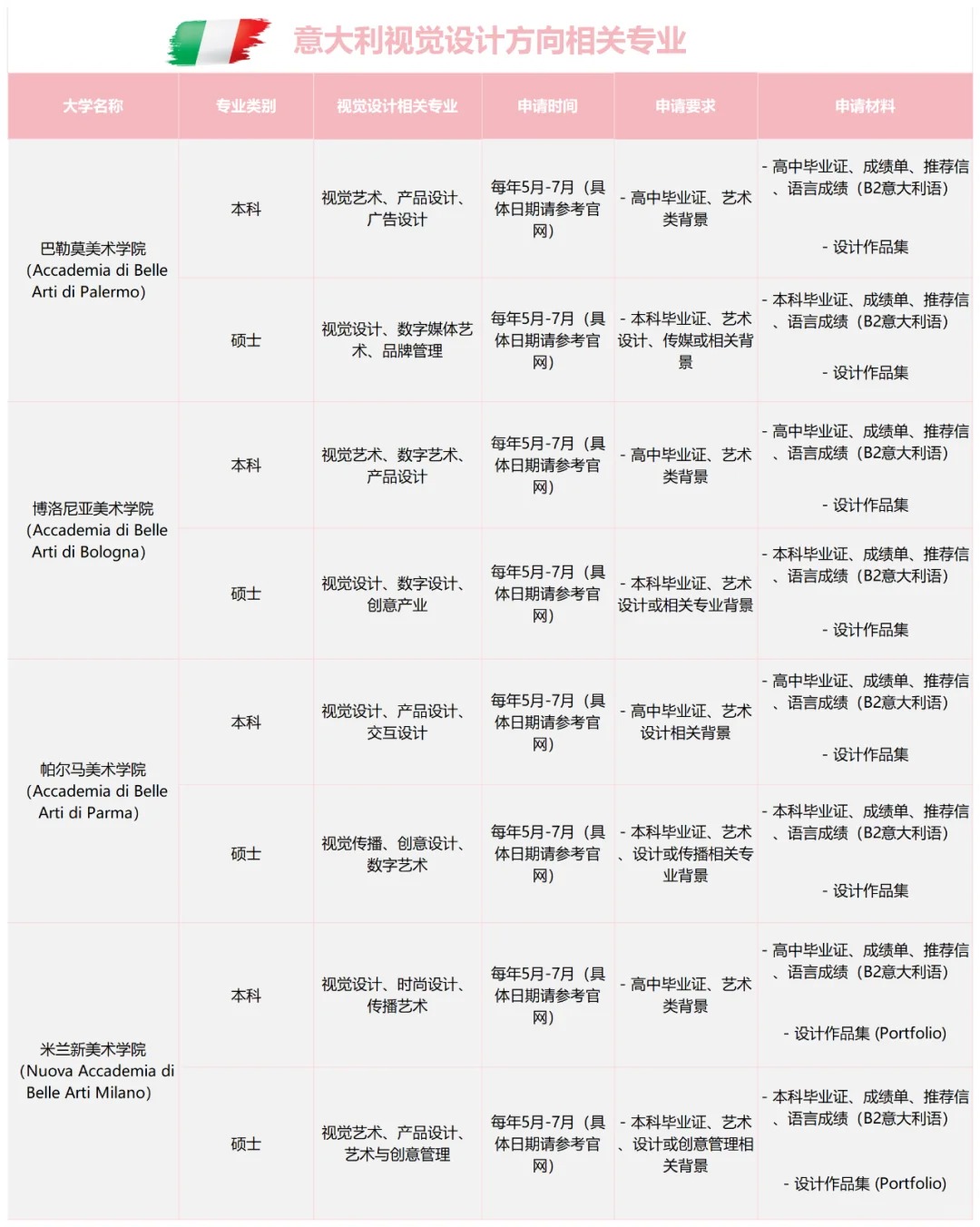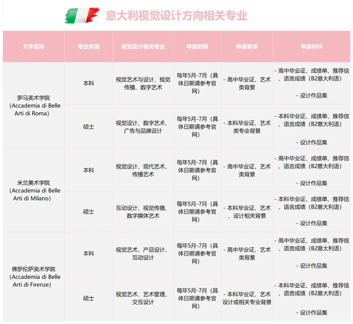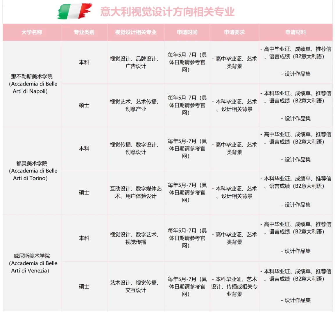 申请要求:要求提供高中毕业证或本科毕业证,部分专业可能要求设计相关的背景或基础知识(如美术类、设计类专业)。大多数院校要求至少B2级的意大利语能力。